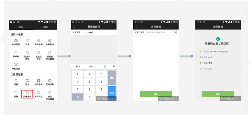1、收銀臺進入“功能”列表, 點擊機擔保撤銷 2、輸入管理員密碼 3、輸入小票上的訂單號。 4、撤銷完成
